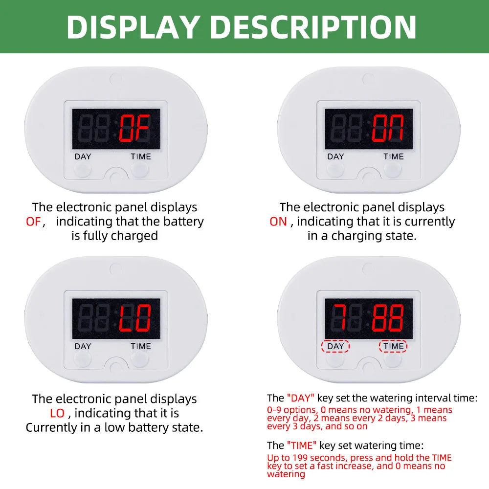 🌻💦【Easy To Set】 This watering system is easy to set. Firstly, set the watering duration from 1~90s or from 2~3mins; then set the watering interval from 12 hours or from 1~10 days. Solve your daily work, take care of plants when traveling question.Automatic watering device can help you water on time every day, make the plants grow healthier and longer lasting, and make your life easier.