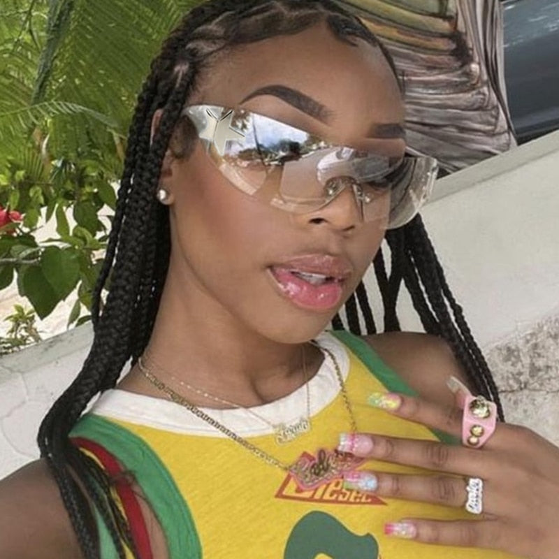 Style: punk Lenses Material: Polycarbonate Lens Width: 76mm Lens Height: 50mm Item Type: Eyewear Gender: WOMEN Frame Material: Plastic Titanium Eyewear Type: Sunglasses